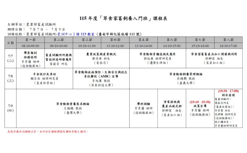 場次一:時間:115年04月20日(一)10:20地點:嘉義市總工會B教室(嘉義市彌陀路255號)講題:母羊乳房炎防治的新觀念講師:國立中興大學獸醫學系莊士德教授場次二:時間:115年04月27日(一...